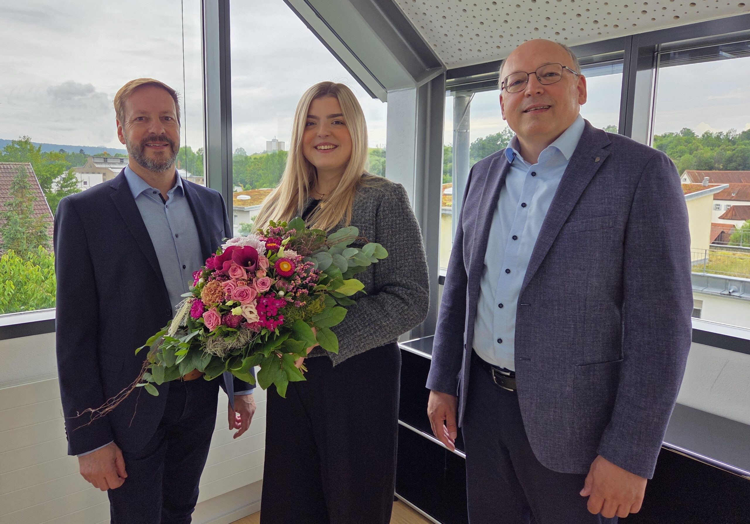 Vorstand Nikolaus Ebert und Prokurist Oliver Janas gratulierten der frisch gebackenen Immobilienkauffrau im Namen der Kreisbau Ostalb.